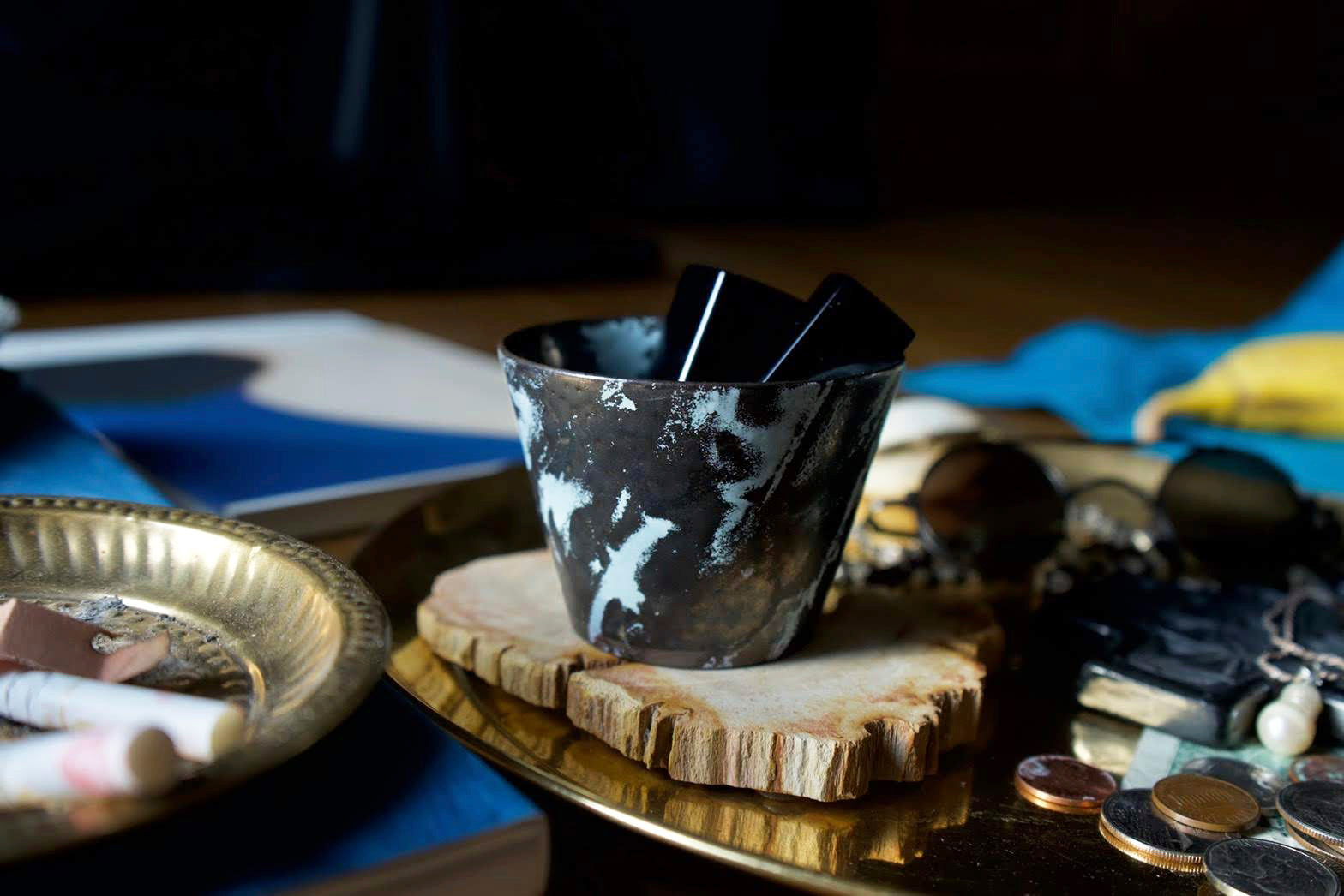 大気圏に浮かぶ雲の様子を表現しています。凹凸感とメタリック感の出る釉薬に移ろいゆく雲のイメージが美しく調和しています。